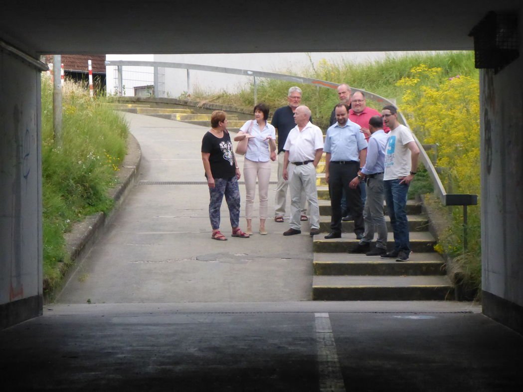 Auf dem Foto sieht man die Rampe von dort aus, wo derzeit der Fahrstuhl am Bahnhof Oftersheim in der Unterführung installiert wird. Mitglieder der SPD-Ratsfraktion und des Ortsvereinsvorstandes machten sich ein Bild davon, dass bei Regen oder gar Schneefall der Weg nach oben für Rollstuhlfahrer praktisch unmöglich wird.