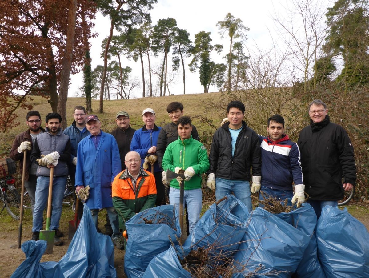 Werner Kerschgens kennt die Pflanzen zu genau, um sie zu übersehen. Selbst verdeckt unter winterlich braunem Gras sieht er sofort, was als unerwünschter Bewuchs Wurzeln schlägt. Und genau solche Pflanzen sollen nicht auf dem Sandboden der Oftersheimer Dünen wachsen, erklärt er auch in diesem Jahr den Helfern, die seinem Aufruf zur Dünenpflege gefolgt sind. „Das machen wir seit bald 20 Jahren schon“, erzählt Kerschgens den Freiwilligen, von denen einige schon bei der letzten Dünenpflege mitgemacht haben. Es sind wieder Flüchtlinge dabei, die vor fast genau einem Jahr ihre Notunterkunft im Gewerbepark Hardtwald bezogen, und damals schon seiner Bitte um Unterstützung folgten. Inzwischen wohnen sie in Containern in Hockenheim und kamen zum Teil mit dem Fahrrad, um wieder tatkräftig mitzuhelfen. Auch neue Helfer aus der Unterkunft im ehemaligen Oftersheimer Gasthaus Zum Hirsch waren dabei. Das Ausreißen der Pflanzen mit Stumpf und Stiel reicht für die Bewahrung der einzigartigen Flora auf dem Magerrasen nicht aus. „Der Boden soll auf keinen Fall überdüngt werden“, sagt Werner Kerschgens. „liegen gelassene Pflanzenreste erhalten so viel Stickstoff, dass sie an dieser Stelle wieder den Nährboden für erneuten und hier unerwünschten Bewuchs liefern.“ Die Pflanzen werden daher eingesammelt und fortgeschafft. Das ist auch der Grund, warum er und sein Mitgemeinderat Bernd Hertlein am Rand der Düne zur Motorsäge greifen und umgestürzte Bäume kleinsägen. Etwa auf sechs bis acht Ster schätzt Werner Kerschgens die diesjährige Ausbeute. Das ist Holz, das gut im Kamin verfeuert werden kann. „Wer das gegen eine Spende selbst abholen möchte, kann sich gerne bei mir melden,“ so Kerschgens. Er ist erreichbar unter der Telefonnummer 9 50 10 37. Den Erlös spendet der Arbeitskreis Öko-Talk-lokal traditionell an Oftersheimer Vereinsprojekte. Andere Hinterlassenschaften wie der wild deponierte Weihnachtsbaum und der über die Düne verteilte Plastik- und Blechmüll landete dagegen gleich in einer der blauen Mülltüten. Der Öko-Talk-lokal selbst erfährt auch beständigen neuen Beistand: Bernd Hertlein wird Arbeitskreissprecher Kerschgens künftig als Stellvertreter zur Seite stehen. Wie im letzten Jahr folgten dieses Mal wieder einige der Flüchtlinge, die 2016 in der Unterkunft im Gewerbepark Hardtwald lebten, der Einladung und halfen tatkräftig mit. Von links nach rechts: Yamen Alsalek, Gamden Suliman, Alexander Leonhardt, Theo Reinhardt, Bernd Hertlein, Werner Kerschgens, Karlheinz Wipfinger-Fierdel, Sakhi Rezai, Hafiz Atai, Chulam Saakhi Akbari, Milad Nederi, Andreas Heisel