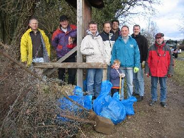 Michael Rauscher, Rainer Eickmeier und Thomas Röhling mit Söhnchen Timo schleppten viele Flaschen, Metall-Teile, Zementbrocken und Drähte zur Sammelstelle. Tiefe Gräben mussten mit dem Spaten geschaufelt werden, damit die in Zement gegossenen Metall-Pfähle freigelegt werden konnten. Die Mitarbeiter des Bauhofs werden sich wundern, was der Ökotalk-lokal mit seinen ehrenamtlichen Helfern alles zum Abtransport „bereitgestellt“ hat.