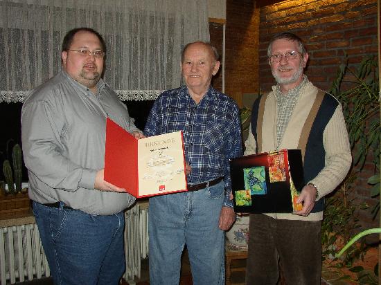 Da der Jubilar auf der Ehrungsveranstaltung der Oftersheimer Sozialdemokraten aus privaten Gründen nicht anwesend sein konnte, wurde Robert Schmieder nun zu Hause geehrt. Zu diesem Anlass kam der Fraktionsvorsitzende Gerhard Wenner und der Ortsvereinsvorsitzende Jens Rüttinger mit den Ehrengaben vorbei. Robert Schmieder wurde für 60 Jahre Mitgliedschaft in der SPD geehrtNachdem der Ortsvereinsvorsitzende die wesentlichsten Funktionen von Robert Schmieder nochmals in Erinnerung rief und ihm die Ehrenurkunde samt Ehrenabzeichen übergab, hatte der Fraktionsvorsitzende das anspruchsvolle Weinpräsent zur Hand. Rüttinger ging in seiner Laudatio auf Schmieders Gemeinderatstätigkeit von 1969 bis 1994 ebenso ein, wie auf die Zeit als Vorsitzender der Gemeinderatsfraktion von 1975 bis 1991.