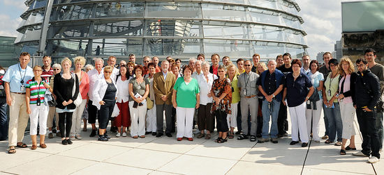 Insgesamt 50 politisch Interessierte aus dem Wahlkreis Bruchsal-Schwetzingen, daruter auch Gemeinderäte aus oftersheim, nahmen vom 22. bis zum 25. Juli 2009 auf Einladung des SPD-Bundestagsabgeordneten Prof. Gert Weisskirchen an einer viertägigen Informationsfahrt nach Berlin teil. Die Besucherinnen und Besucher erwartete ein umfangreiches Bildungsprogramm, das von Werner Henn, dem Kandidaten im Wahlkreis begleitet wurde. Nach Besuchen und Diskussionsrunden im Bundespresseamt, dem Auswärtigem Amt, des Willy-Brandt-Hauses und des Bundesrates stand ein Besuch des Holocaustdenkmals nahe des Potsdamer Platzes auf dem Programmablauf. Höhepunkt war sicherlich die Informationsveranstaltung im Plenarsaal des Bundestages mit anschließender politischer Runde, durch die Werner Henn souverän führte. Der Rundgang und das Gruppenfoto auf der Kuppel des Reichstagsgebäudes krönten eine sehr informative und spannende Reise, die den Teilnehmern sicher lange in Erinnerung bleiben wird.