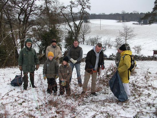 Dann knüpften sich die Organisatoren vom „Ökotalk-lokal“, Werner Kerschgens und Peter Wierer, von der „Nabu“, Manfred Pauli und Karl Schneider sowie von der „Lokalen Agenda 21“, Dr. Maximilian Fichtner und Thomas Roehling, den Elektro-Zauns vor. Mit von der Party war Yvonne Wierer, die auch noch die Männer mit heißem Kaffee versorgte. Bekanntlich dürfen aufgrund des Vogelschutzes ab 1. März keine Bäume und Hecken geschnitten oder gerodet werden. Lange Brombeer-Ranken sind in das Netz des Zauns gewachsen und mussten herausgelöst werden. Geschätzt werden die Brombeeren wegen ihren süßen Früchten und gehasst wegen ihrer Stacheln. Mit Ast- und Gartenscheren wurden die stechenden Triebe von den ehrenamtlichen Helfern abgeschnitten. Manchmal war ein Aufschrei von den beiden Siebenjährigen – Timo und Vivienne – zu hören, wenn sie sich an den ekligen Stacheln der Brombeer-Ranken verletzten. Plötzlich kullerte Männertreu, auch als Steppenroller bekannt, den Helfern vor die Füße. Die Pflanze liebt trockenen, nährstoffarmen Dünensand. Am Stängel befindet sich eine sogenannte Soll-Bruchstelle. Die Staude wird nach der Blüte durch den Wind von der Wurzel abgetrennt und weggerollt, damit sie den Samen verteilen kann. In Zeiten der Kreuzzüge wurde getrocknetes Männertreu in Kissen gefüllt und den Ritter-Frauen ins Bett gelegt. Das Picksen sollte sie zur Treue ermahnen; daher der Name „Männertreu“.