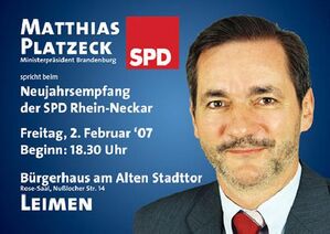 Der SPD-Kreisverband Rhein-Neckar lädt zu seinem traditionellen Neujahrsempfang am Freitag, den 2. Februar 2007 um 18.30 Uhr im Bürgerhaus am Alten Stadttor, Nußlocher Str. 14, in Leimen recht herzlich ein. Als Redner konnte der Kreisverband den Ministerpräsidenten des Landes Brandenburg und ehemaligen SPD-Vorsitzenden Matthias Platzeck gewinnen.