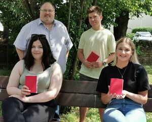 Bildunterschrift:Übergabe der Parteibücher durch den Vorsitzenden im Gemeindeparkv.l. Cara Fassott, Paula Völker, hintenv.l. Jens Rüttinger, Adrian Rüttinger